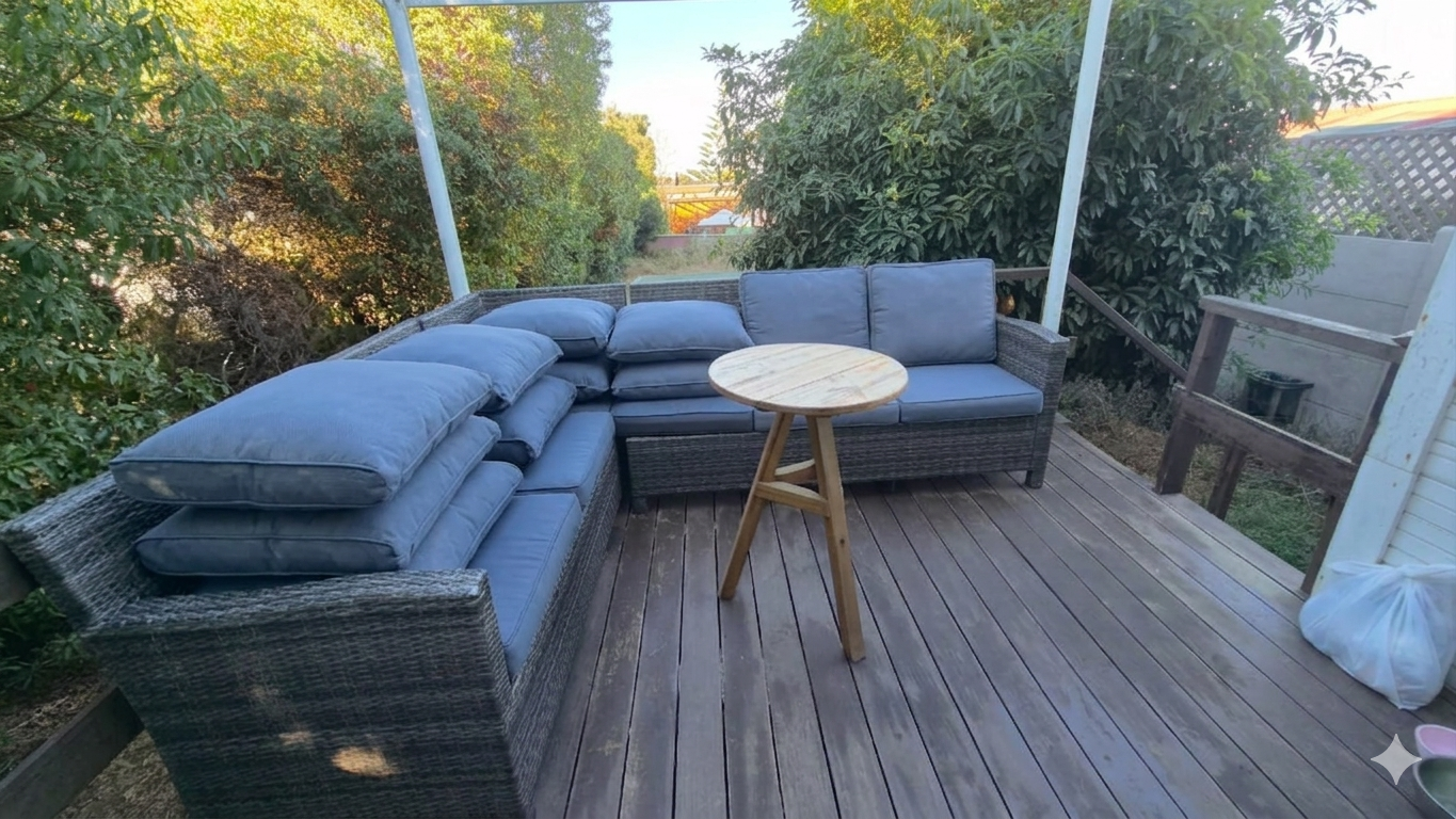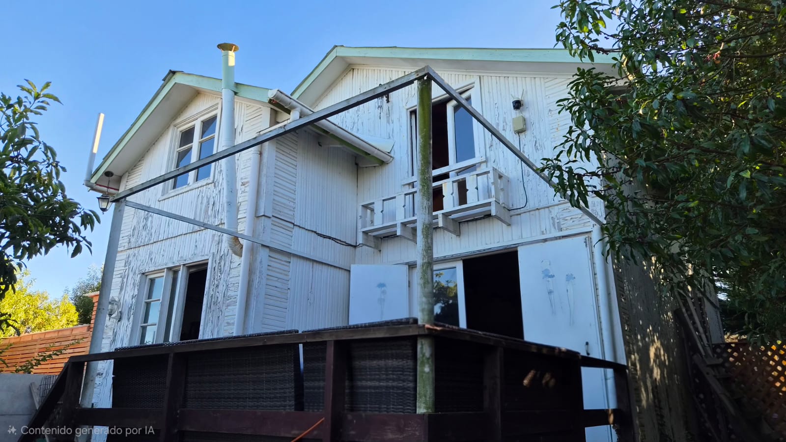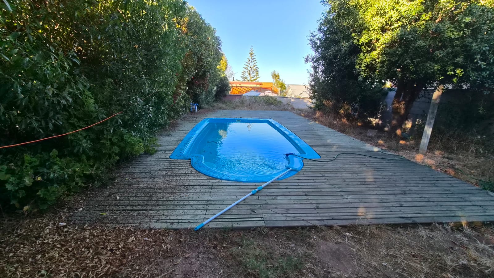 Exteriores: Piscina inserta en terraza tipo deck, patio interior, zona de parrilla y hermoso parrón de acceso.