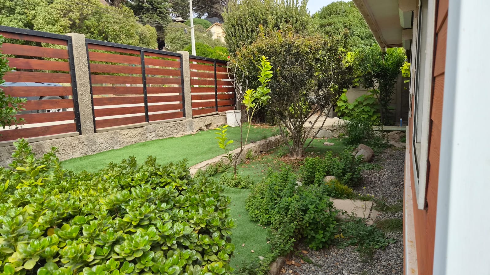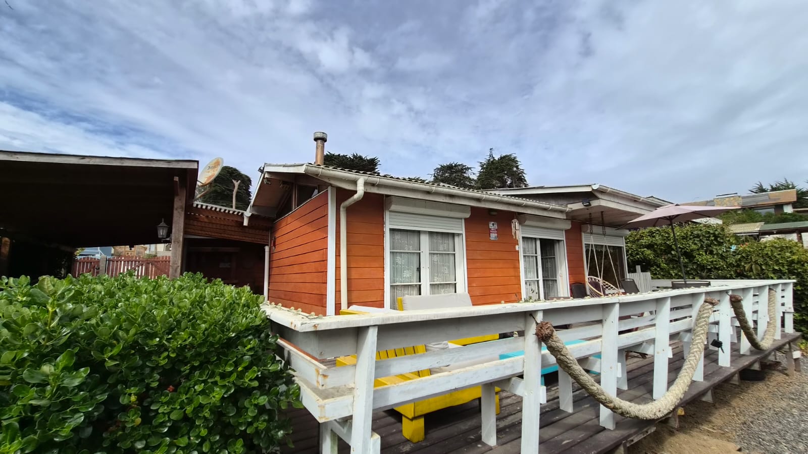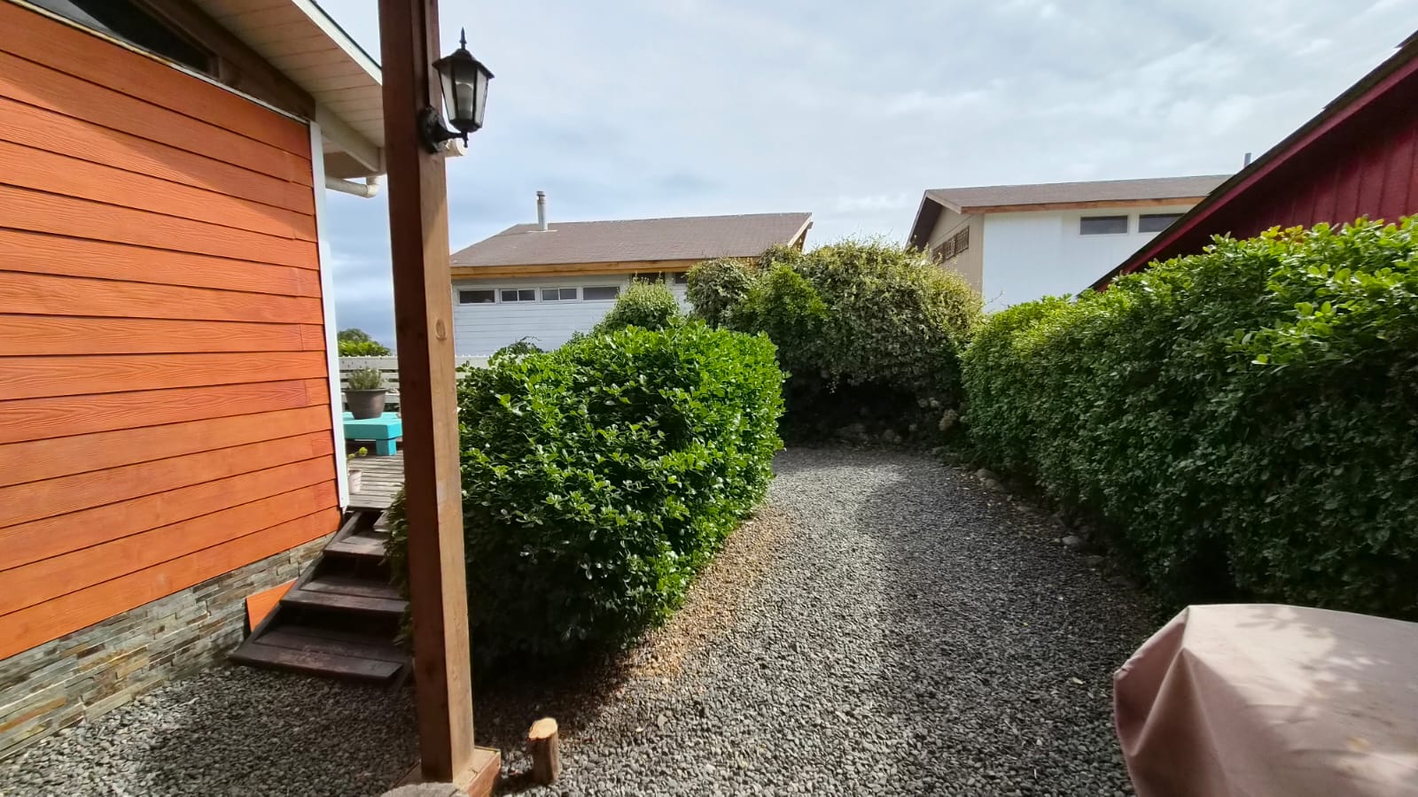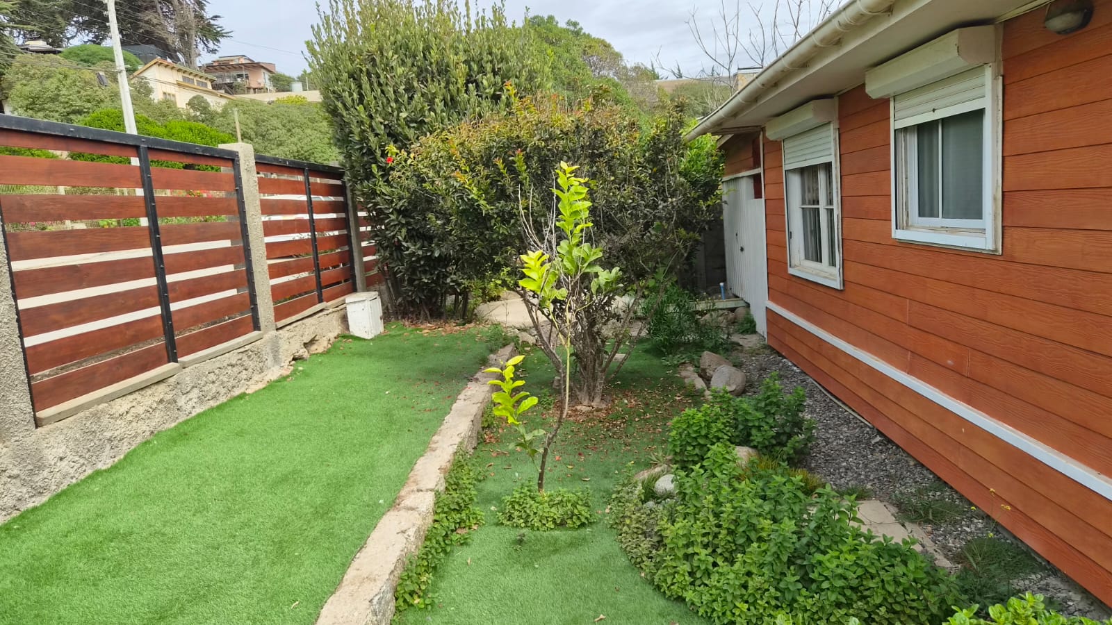 Patio interior techado y bodega ,estacionamiento techado , Hermoso jardín en su patio principal y en patio trasero ambientado con gravilla . Revestimiento exterior en siding de fibrocemento, pensado para la costa .