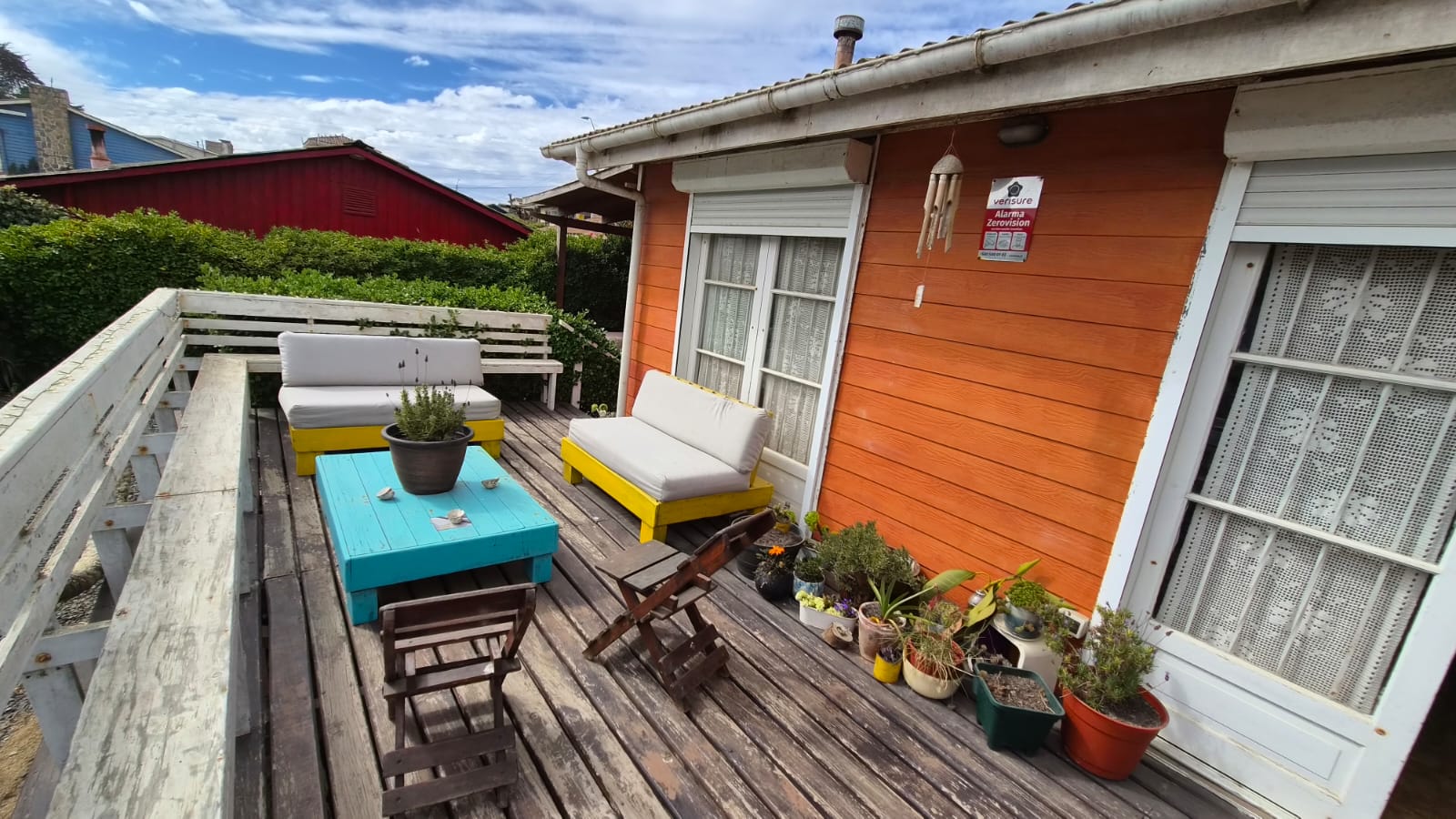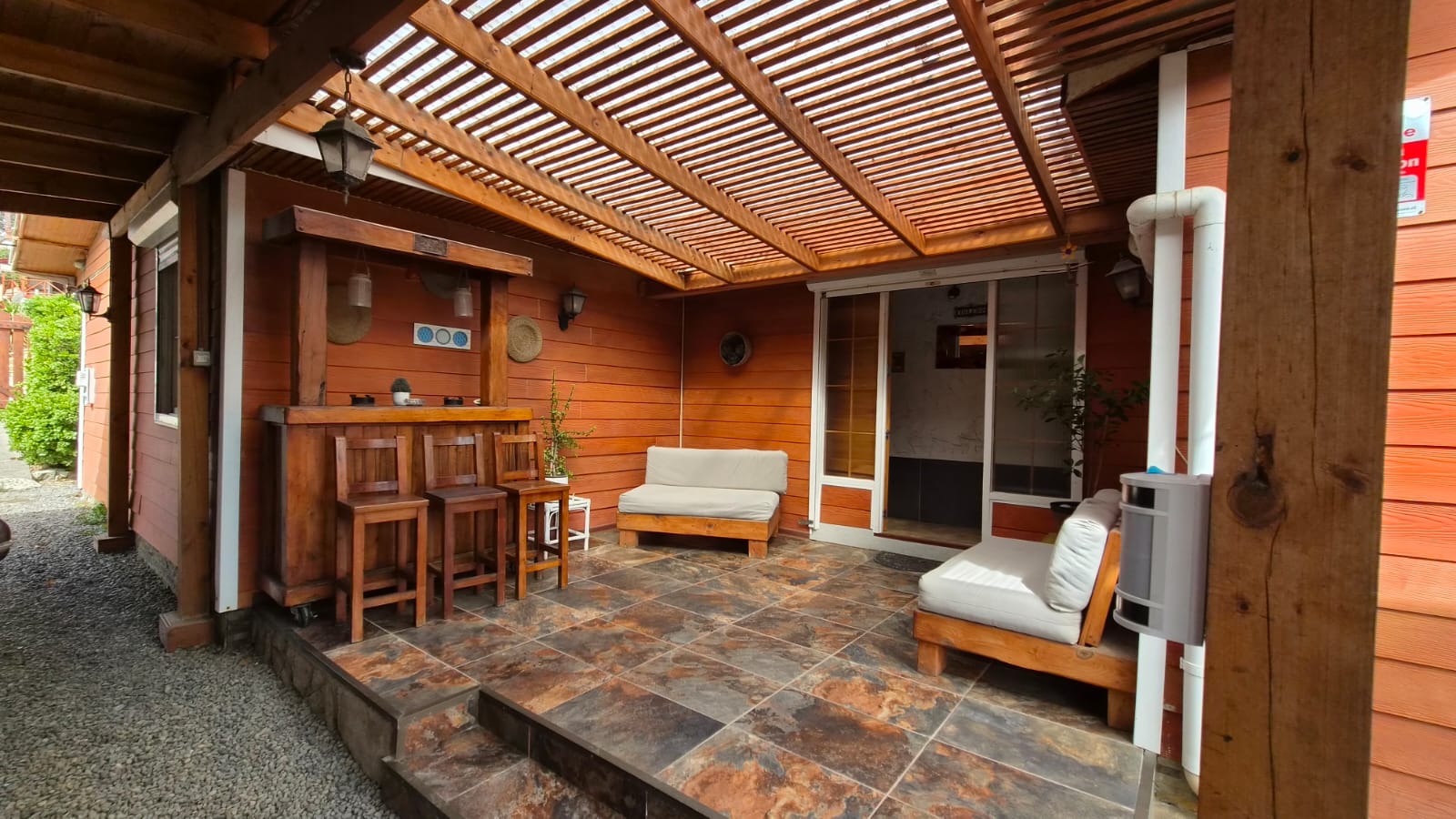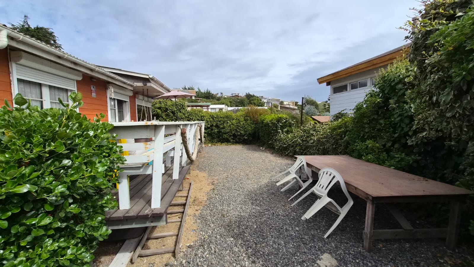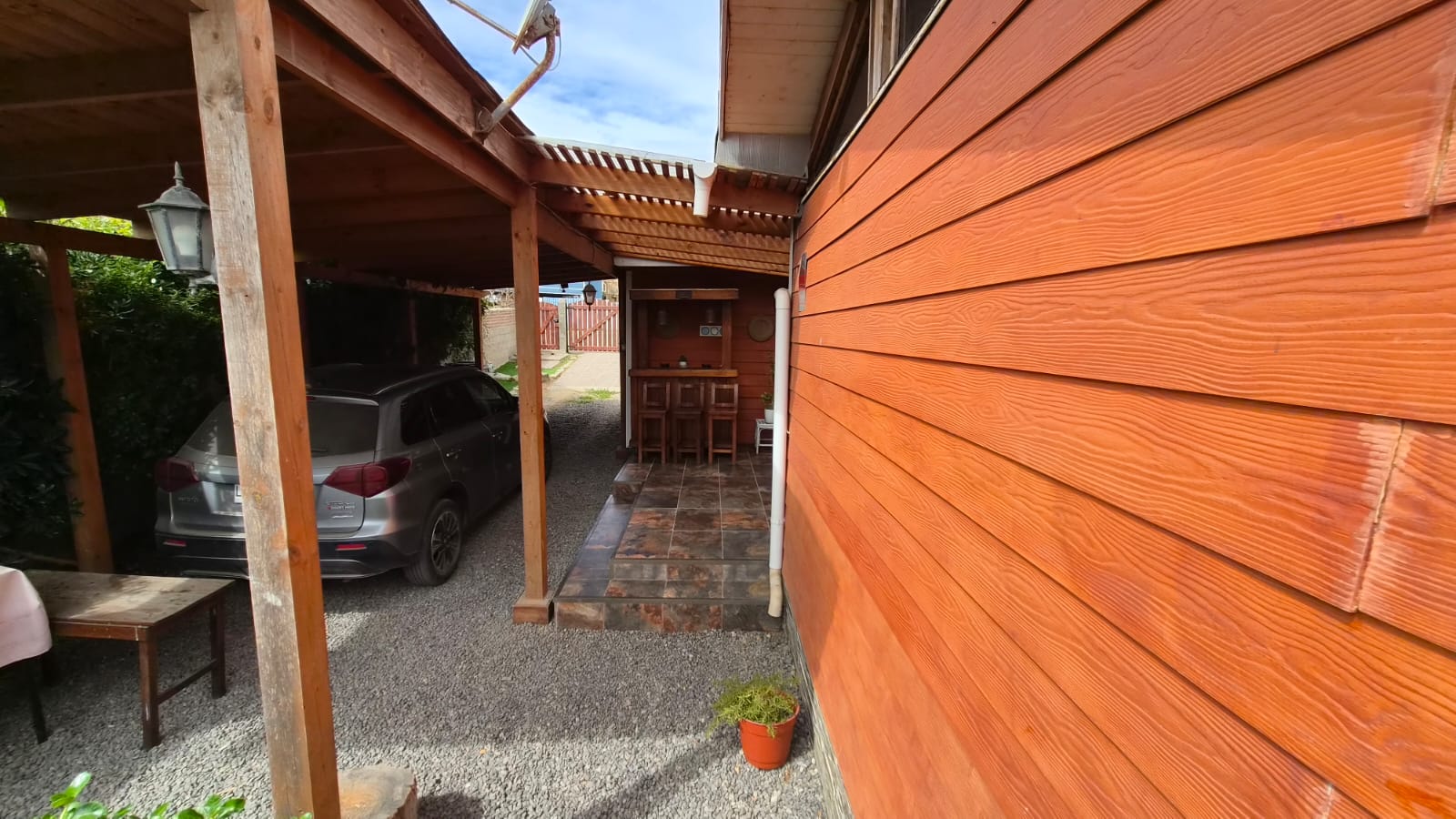 Patio interior techado y bodega ,estacionamiento techado , Hermoso jardín en su patio principal y en patio trasero ambientado con gravilla . Revestimiento exterior en siding de fibrocemento, pensado para la costa .