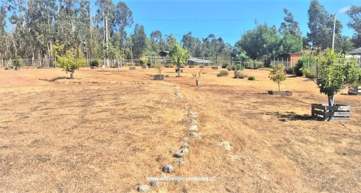 Vegetación: Terreno destroncado, con plantación de especies ornamentales y árboles frutales. completamente limpia y adaptada para continuidad del proyecto en construcción.